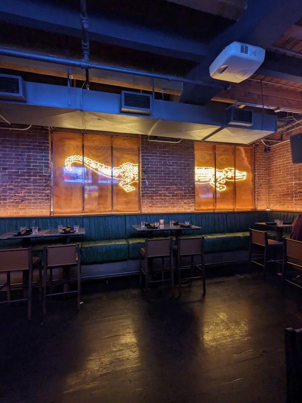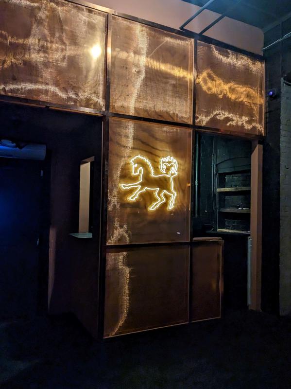 Ferrier Wire + Design Metals Copper 88028 design weavemesh pattern highlighted throughout signage and cabinet bars in Toronto's Premier Sports and Country bar on King Street West. The copper weavemesh was an excellent choice to marry the country western vibe with the modern feel of the bar.